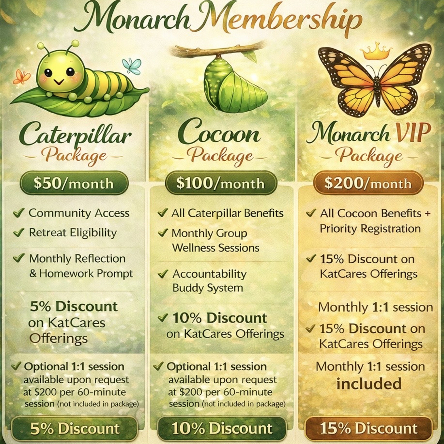 The Monarch Self-Care Transformation Membership offers a unique, holistic approach to self-care and personal growth. Whether you’re looking to make lasting changes, improve emotional and mental wellness, or connect with a supportive community, this program is here for you.